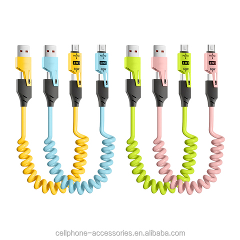 สายชาร์จเร็ว60W แบบ4-in-1อเนกประสงค์, สายชาร์จเร็วสาย USB แบบสปริงชาร์จขนาดกะทัดรัดสำหรับโทรศัพท์แล็ปท็อปแท็บเล็ต